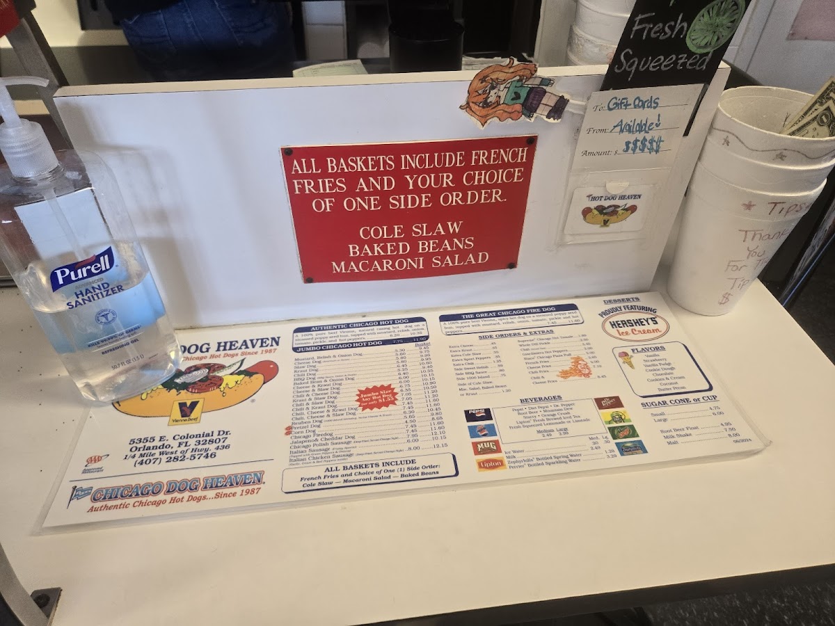 The menu is structured to support quick ordering and casual dining, making it suitable for lunch or light meals throughout the day. Customers can select from straightforward hot dog combinations, add complementary sides, and choose from classic sweet beverages or dessert treats.