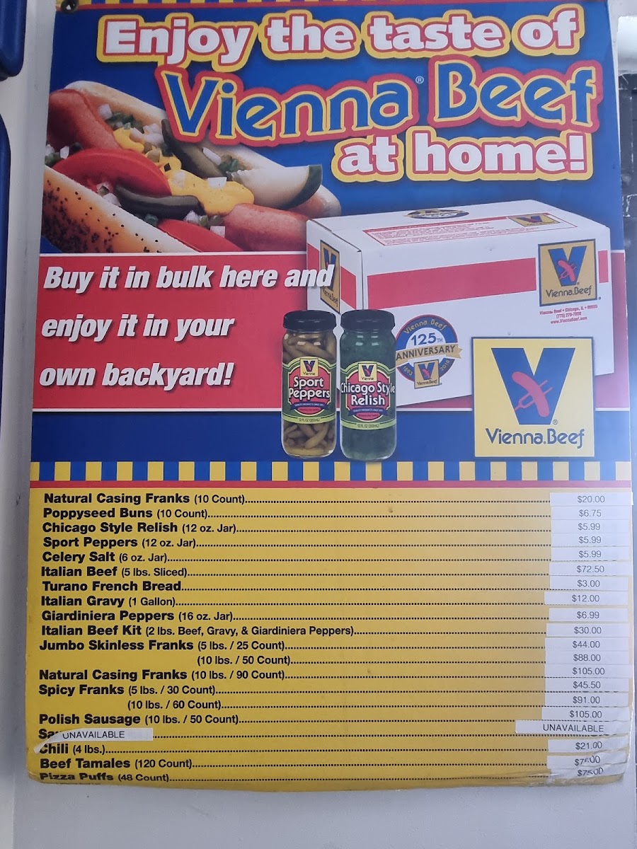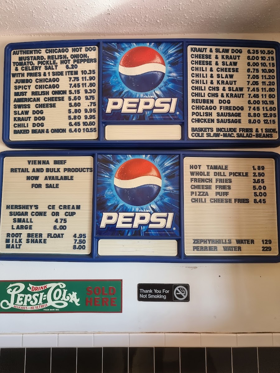 The menu offers a variety of hot dog options available all day, featuring classic styles such as the Authentic Chicago Hot Dog, Mustard, Relish & Onion Dog, Cheese Dog, Slaw Dog, and Kraut Dog. More specialized choices include Chili Dog variants, BBQ Pickle and Onion Dog, and combinations with cheese, slaw, or kraut. Additionally, there are specialty items like the Pretzel Dog and Chicago Firedog.